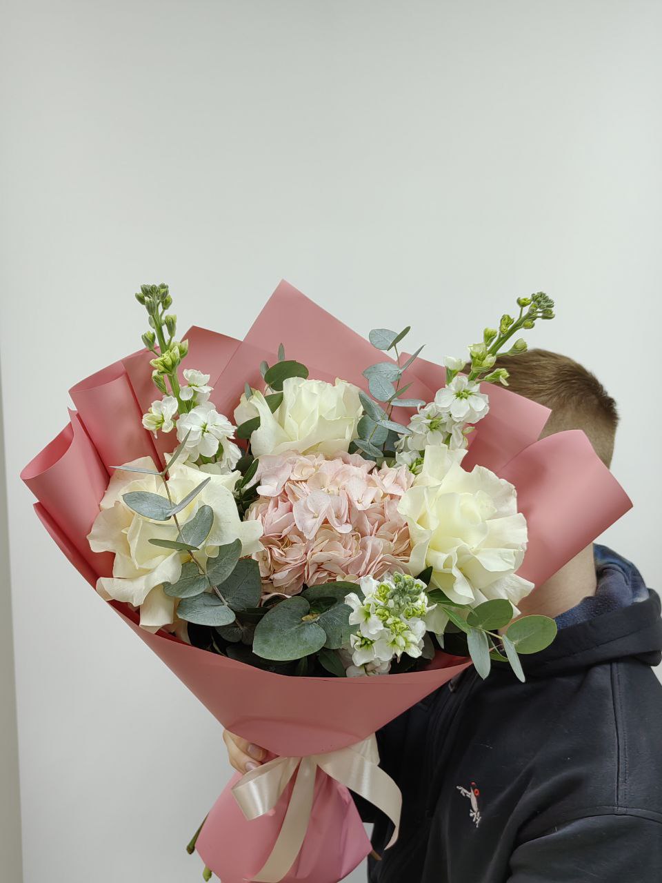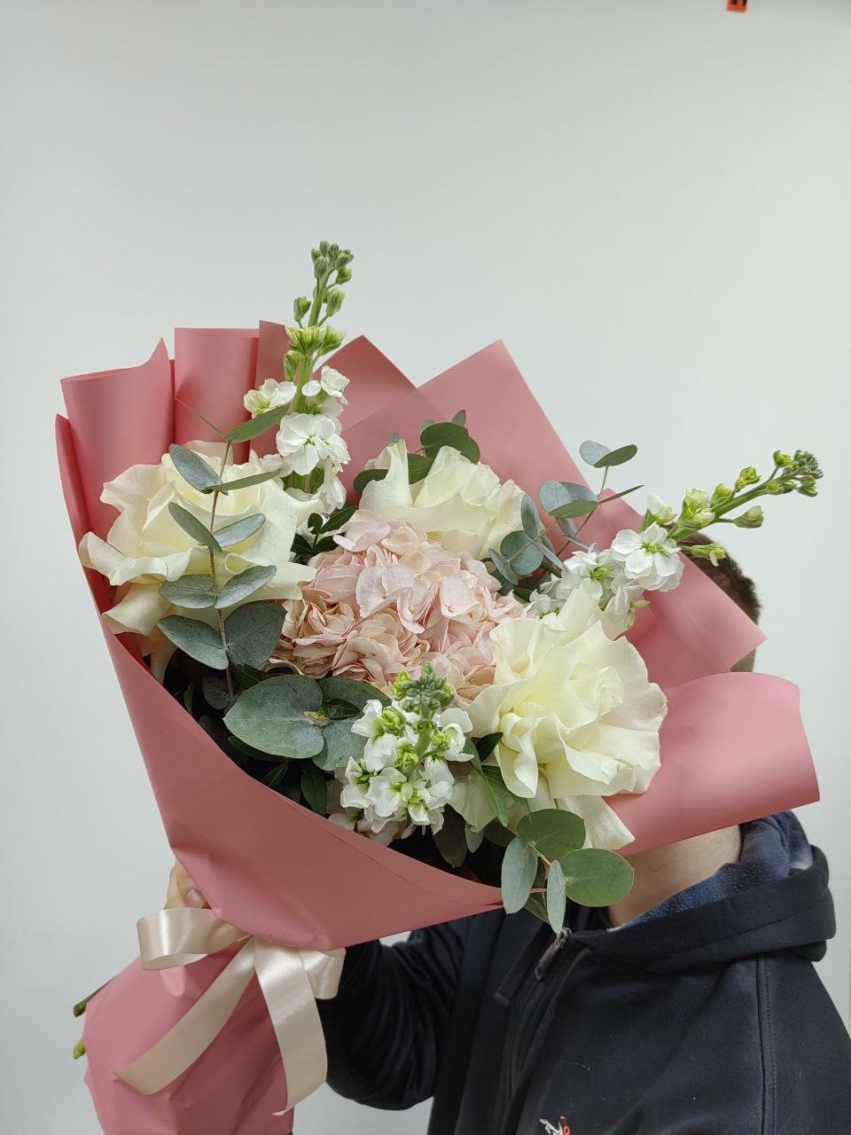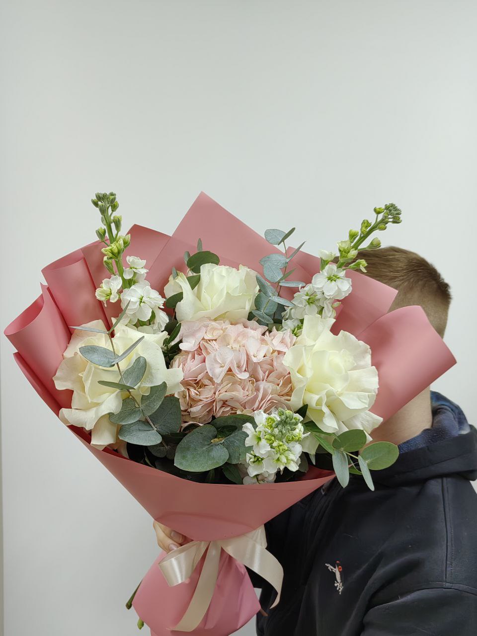 Ароматная маттиола в сочетании с пушистой гортензией и французскими розами создают гармоничный букет.