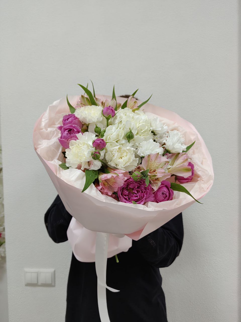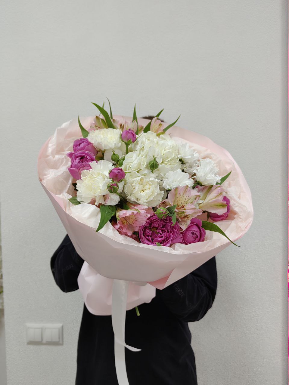 Нежный букет с гортензией,диантусами и альстромериями