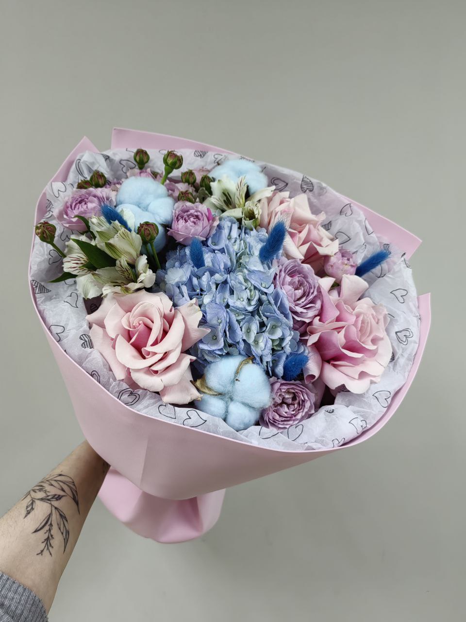 Нежный букет в розовых оттенках с акцентной гортензией,голубым хлопком и лагурусом