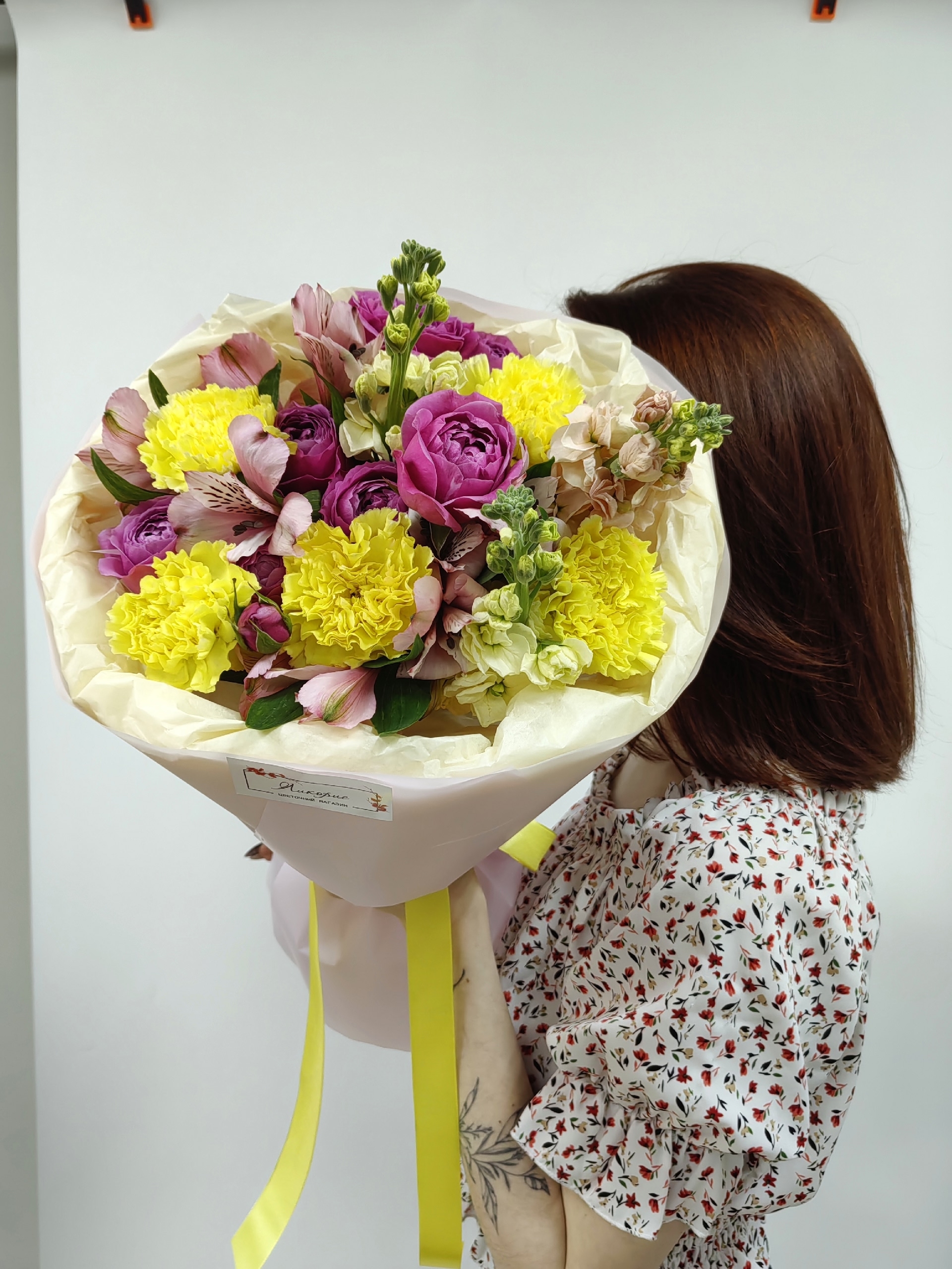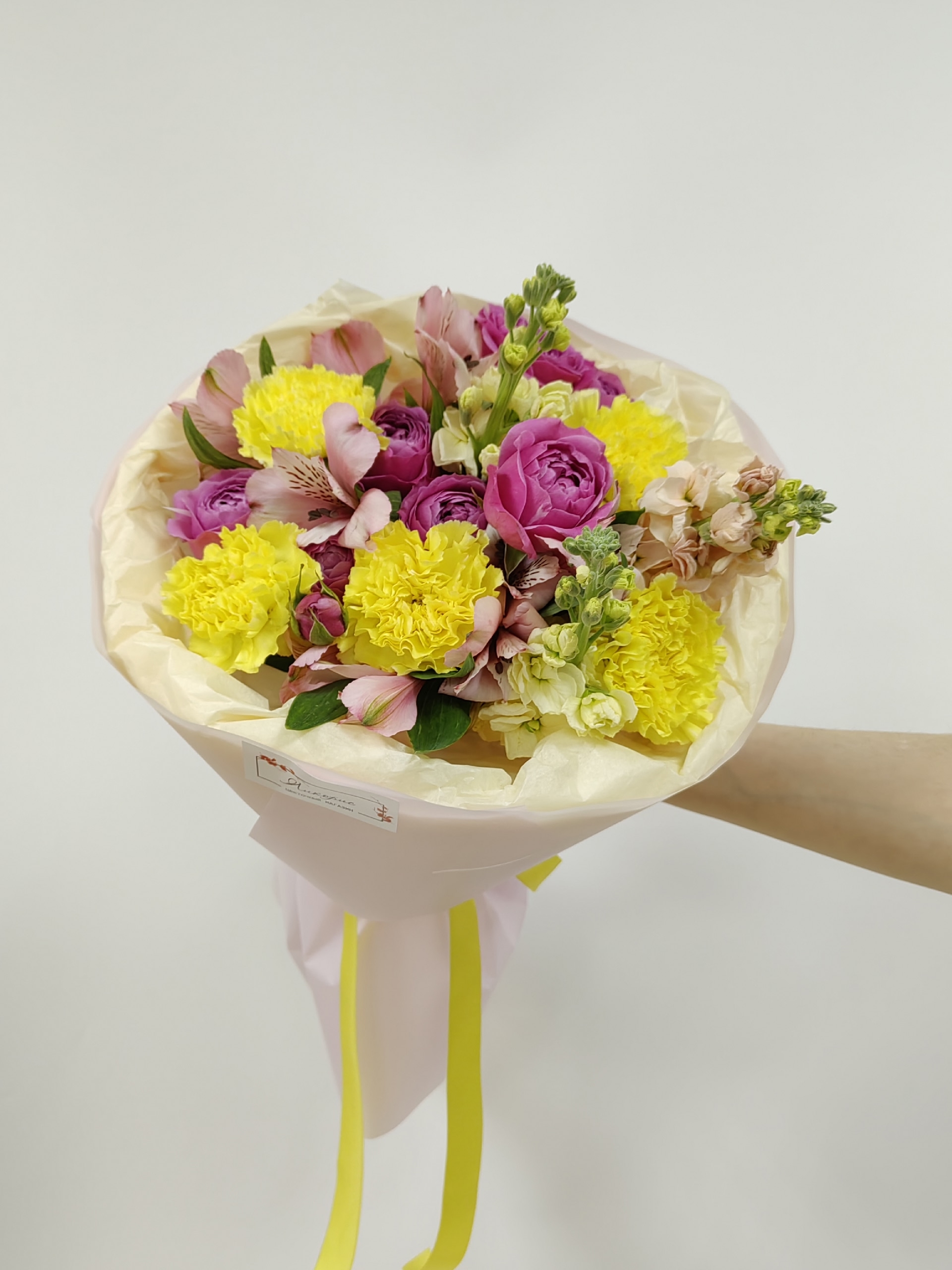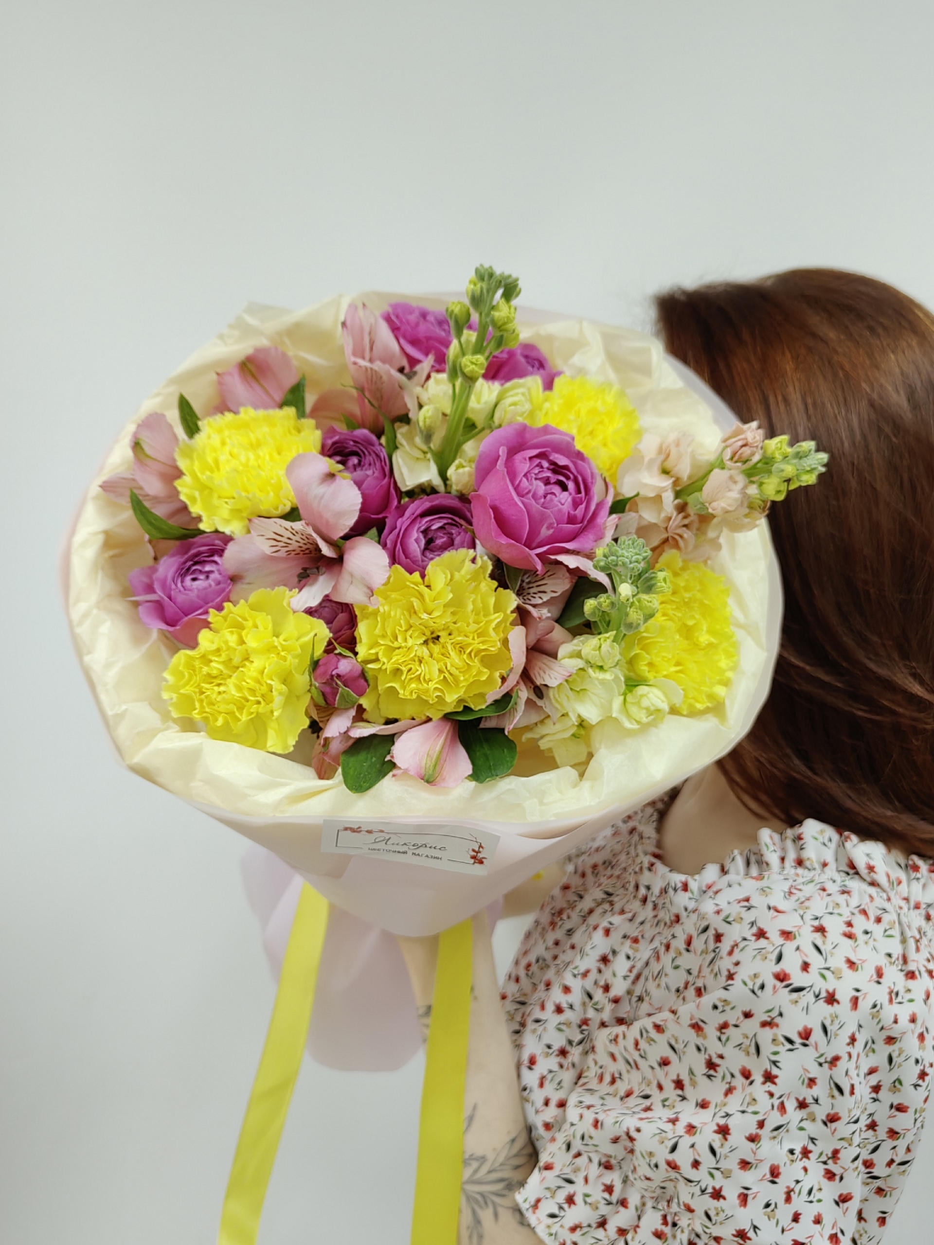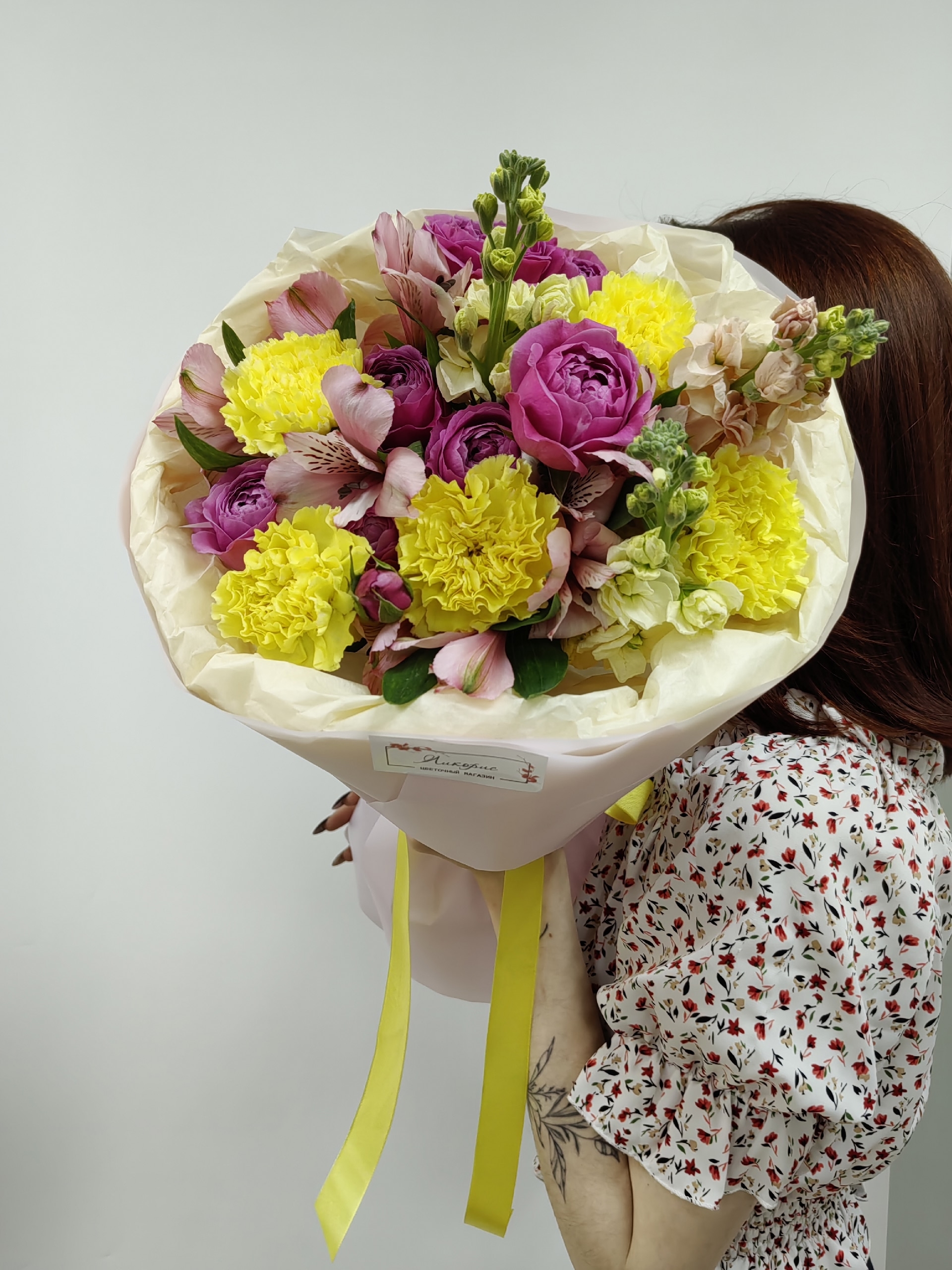 Дофаминовый букет с жёлтыми диантусами и маттиолой
