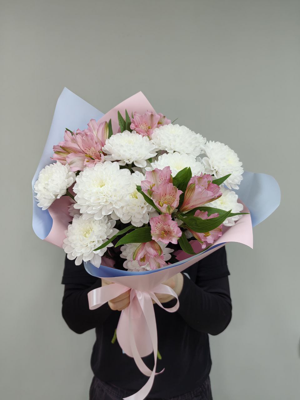 Свежие альстромерии и стойкие хризантемы в составе Дуо букета
