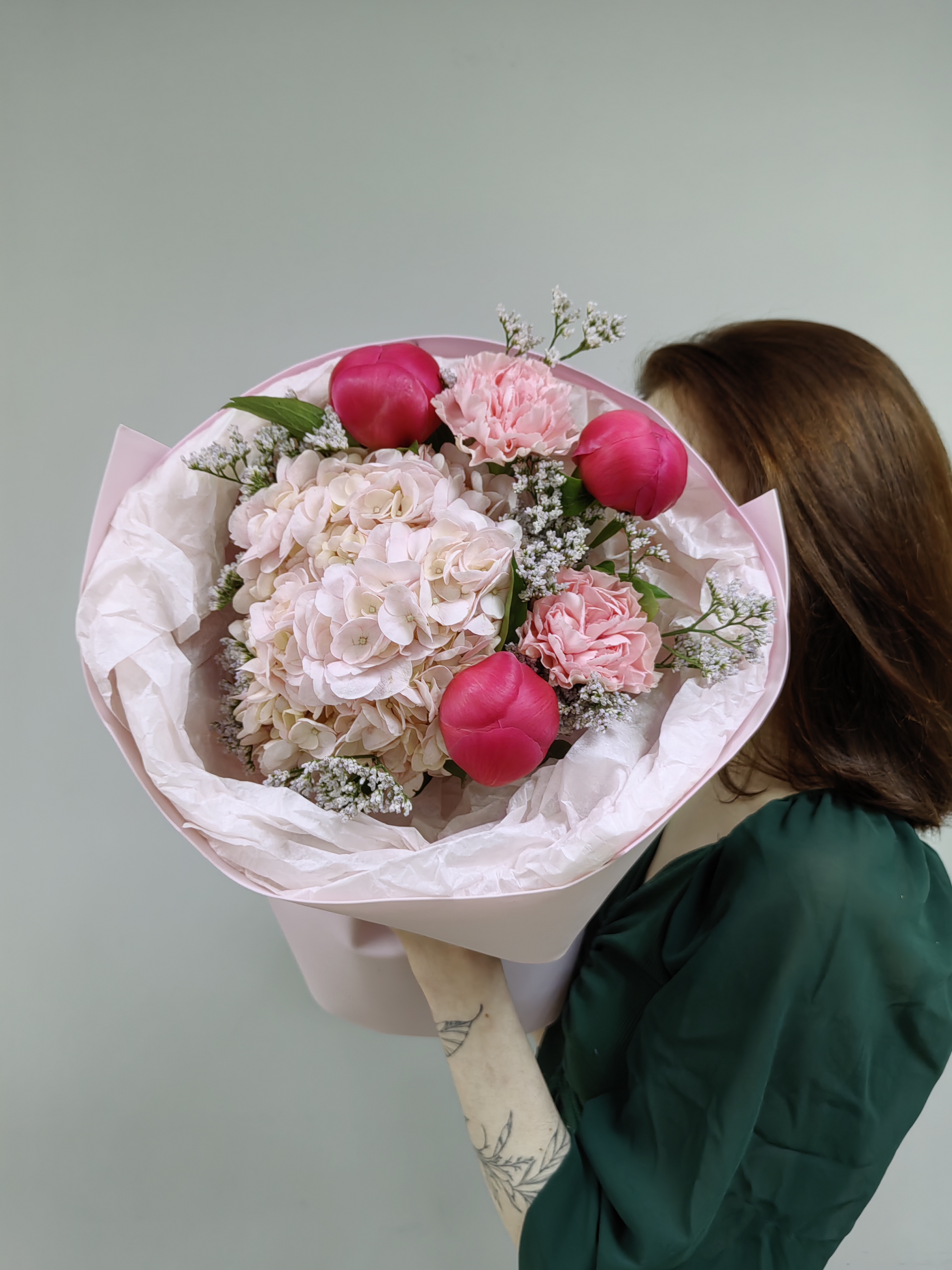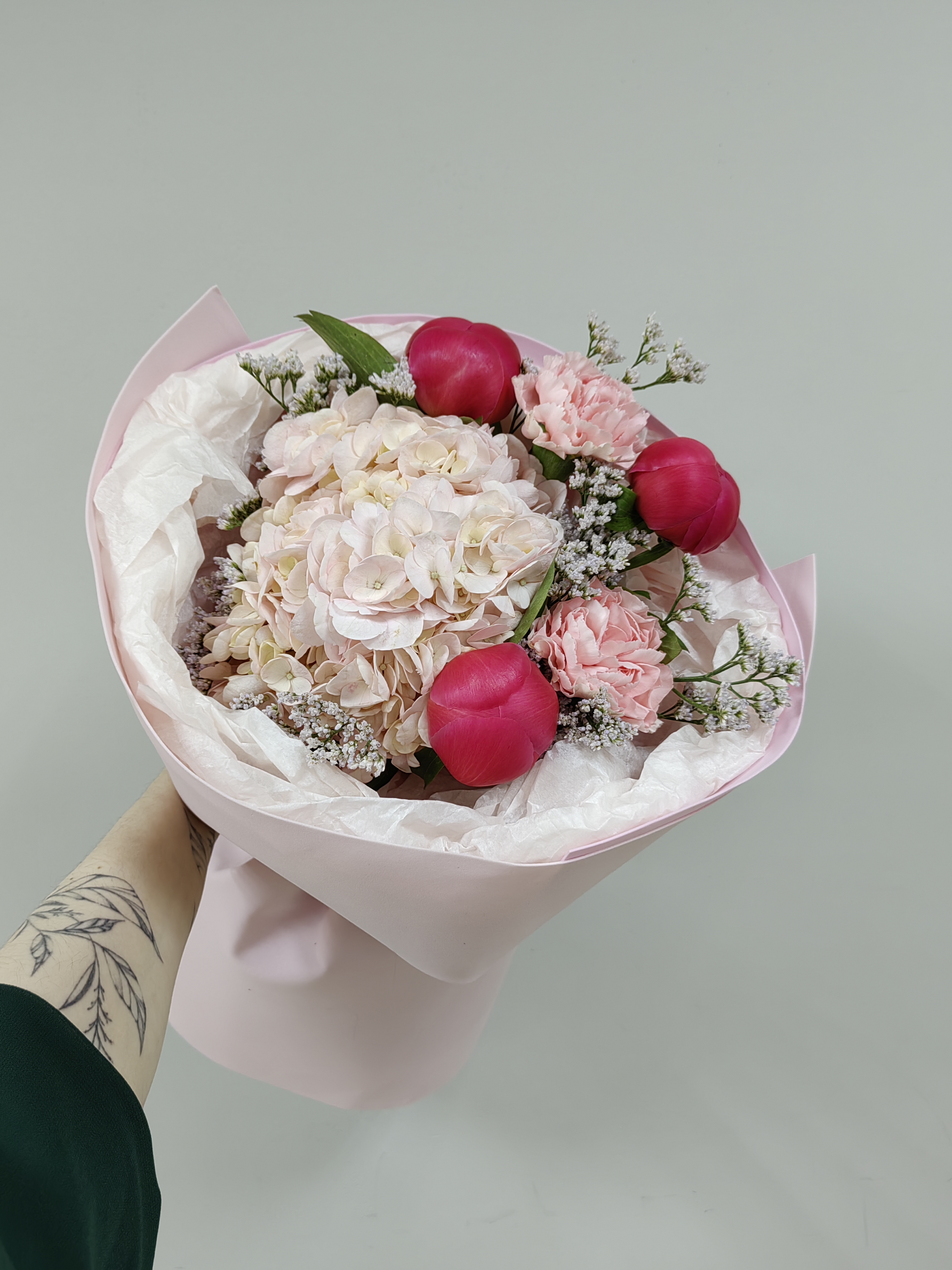 Нежный букет с пышной гортензией и ароматными французскими розами, в сочетании...