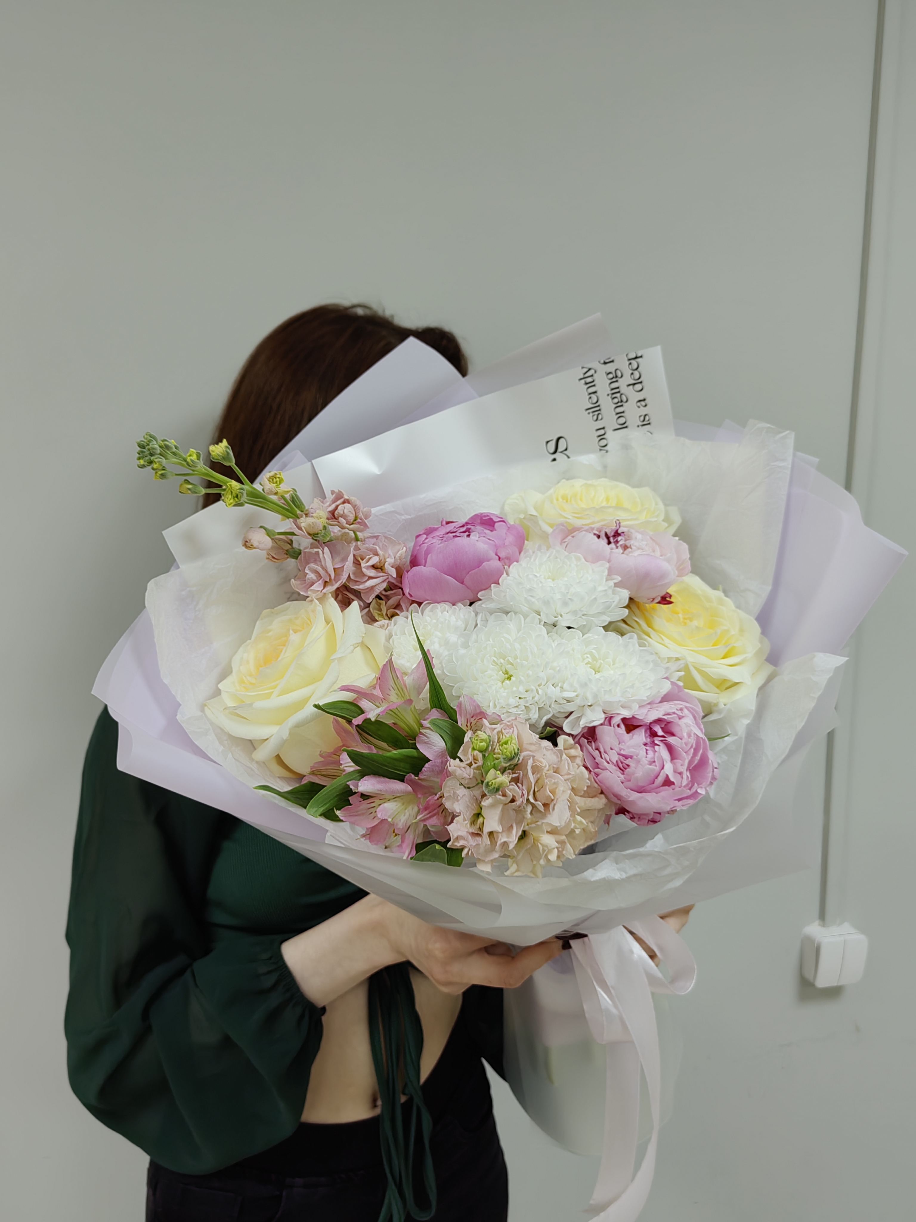 Французские розы в сочетании с белыми альстромериями-идеальный вариант для любим...
