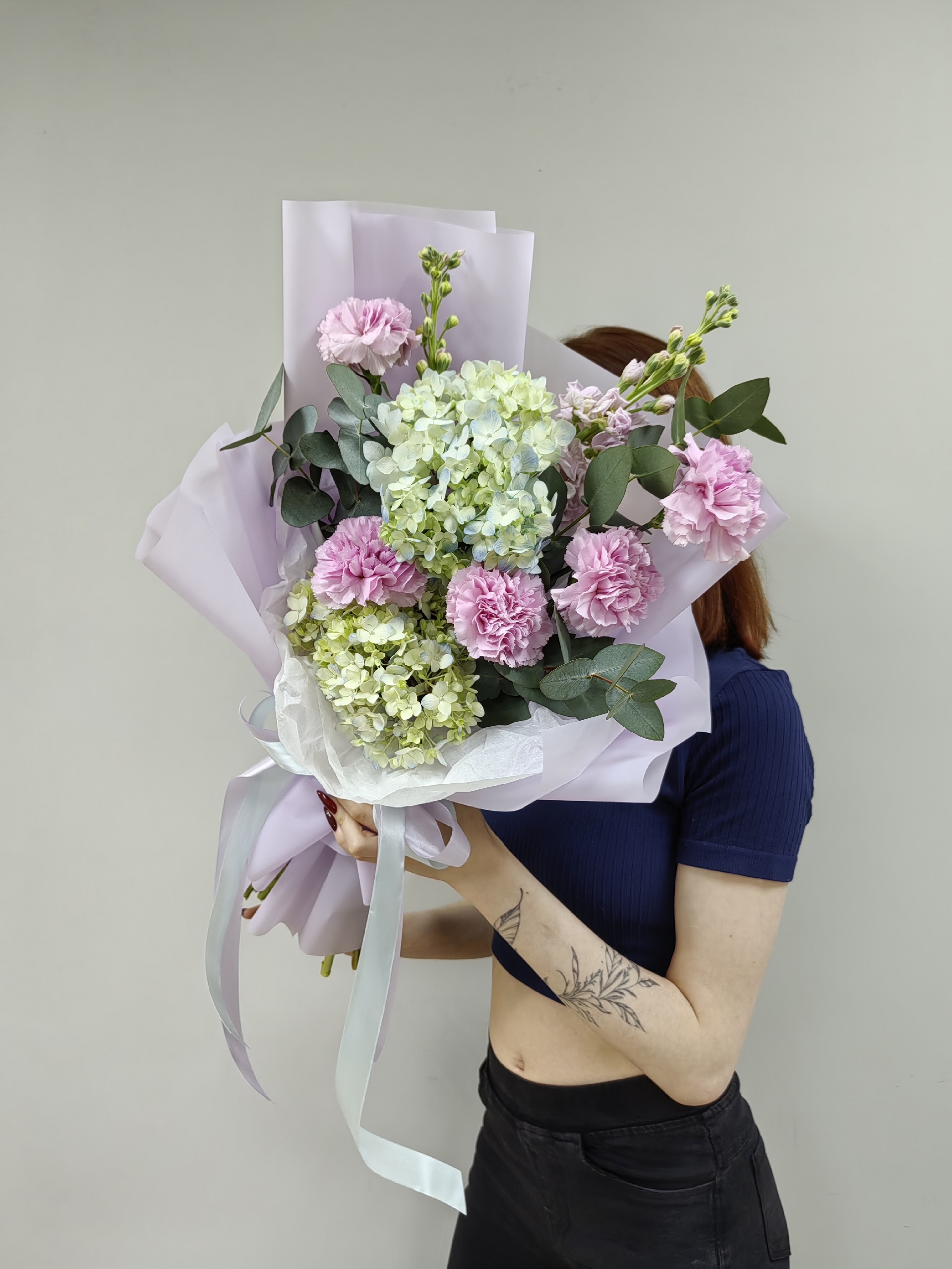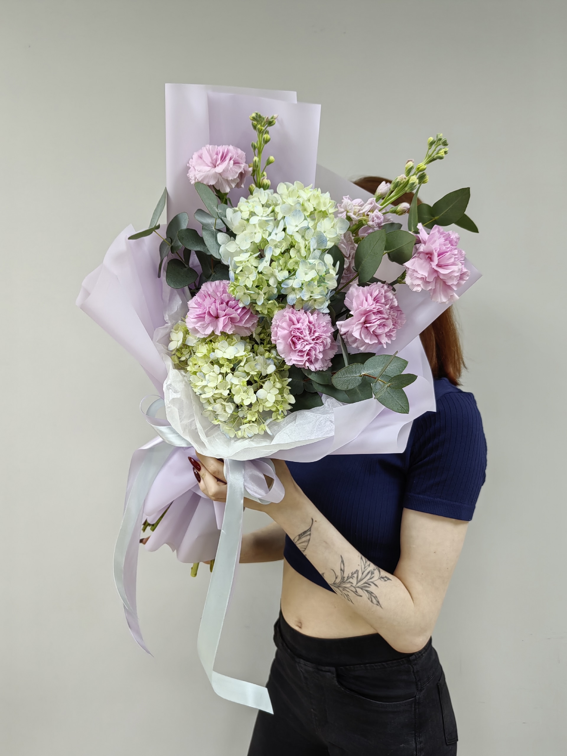 Нежный букет с пышной гортензией и ароматными французскими розами, в сочетании...